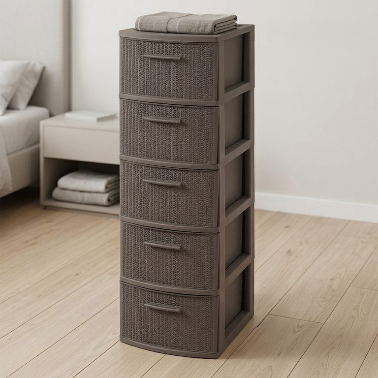 Este cajonero de 5 niveles con textura tipo crochet es práctico y funcional. Te ayuda a mantener el orden en cualquier espacio sin perder estilo. Es ideal para guardar ropa, juguetes, libros y más.