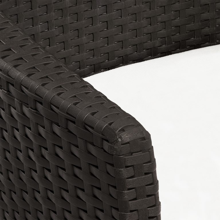 Sillas tipo ratán: Acabado tipo mimbre moderno, resistente al sol y la humedad. Incluyen cojín para mayor comodidad.