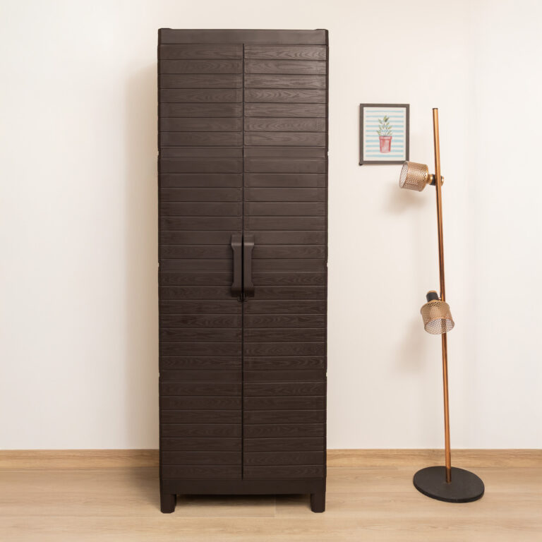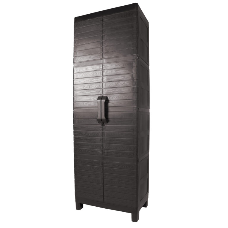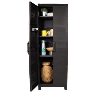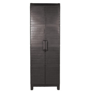 Armario Montana tamaño XL en resina postconsumo reutilizada con texrura tipo madeira, resistente y práctico, incluye tres repisas internas y puertas frontales para fácil organización. Ideal para mantener ordenados tus espacios interiores o exteriores.