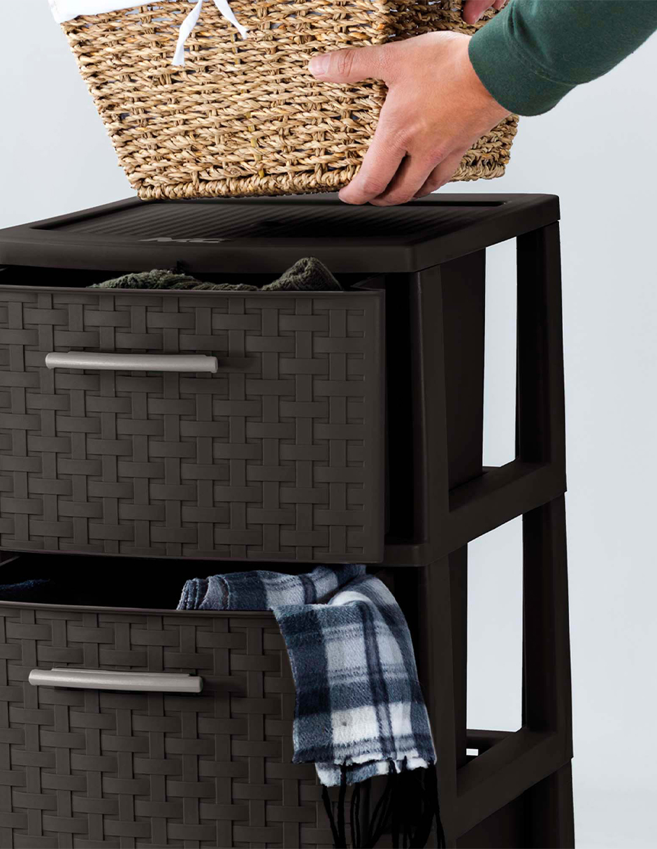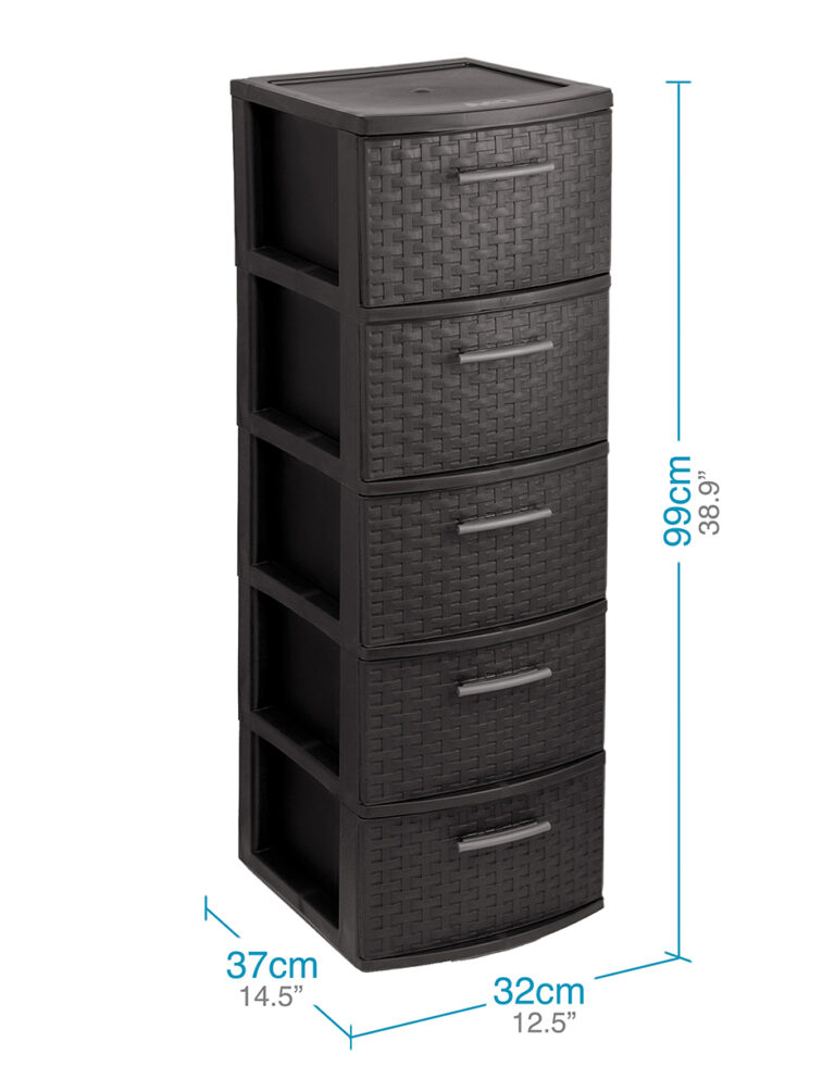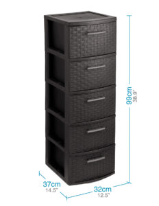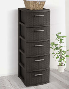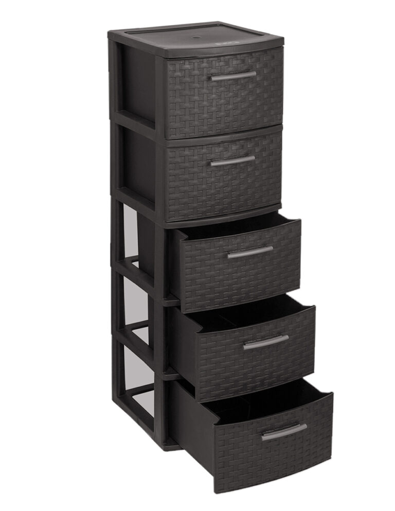 Este cajonero de 5 niveles con textura tipo ratán es práctico y funcional. Te ayuda a mantener el orden en cualquier espacio sin perder estilo. Es ideal para guardar ropa, juguetes, libros y más.