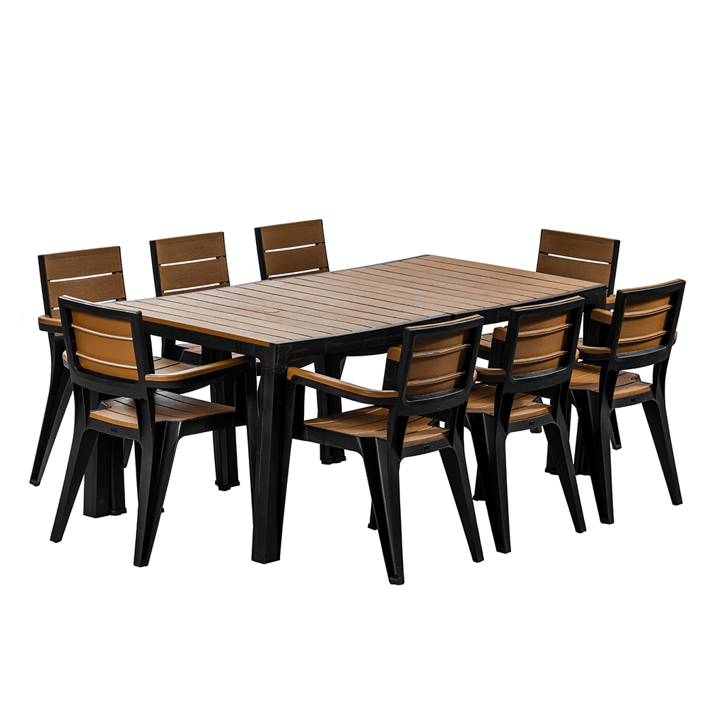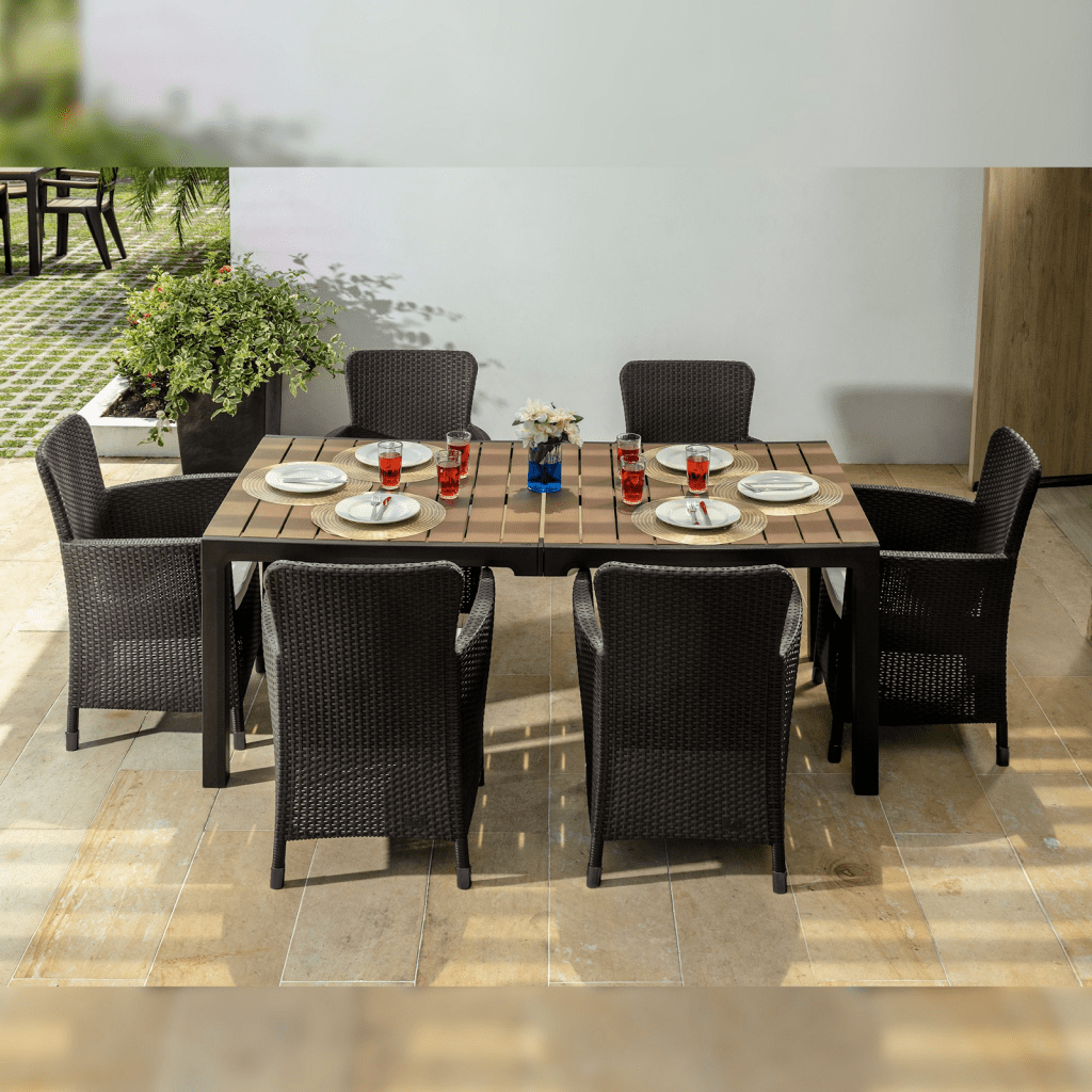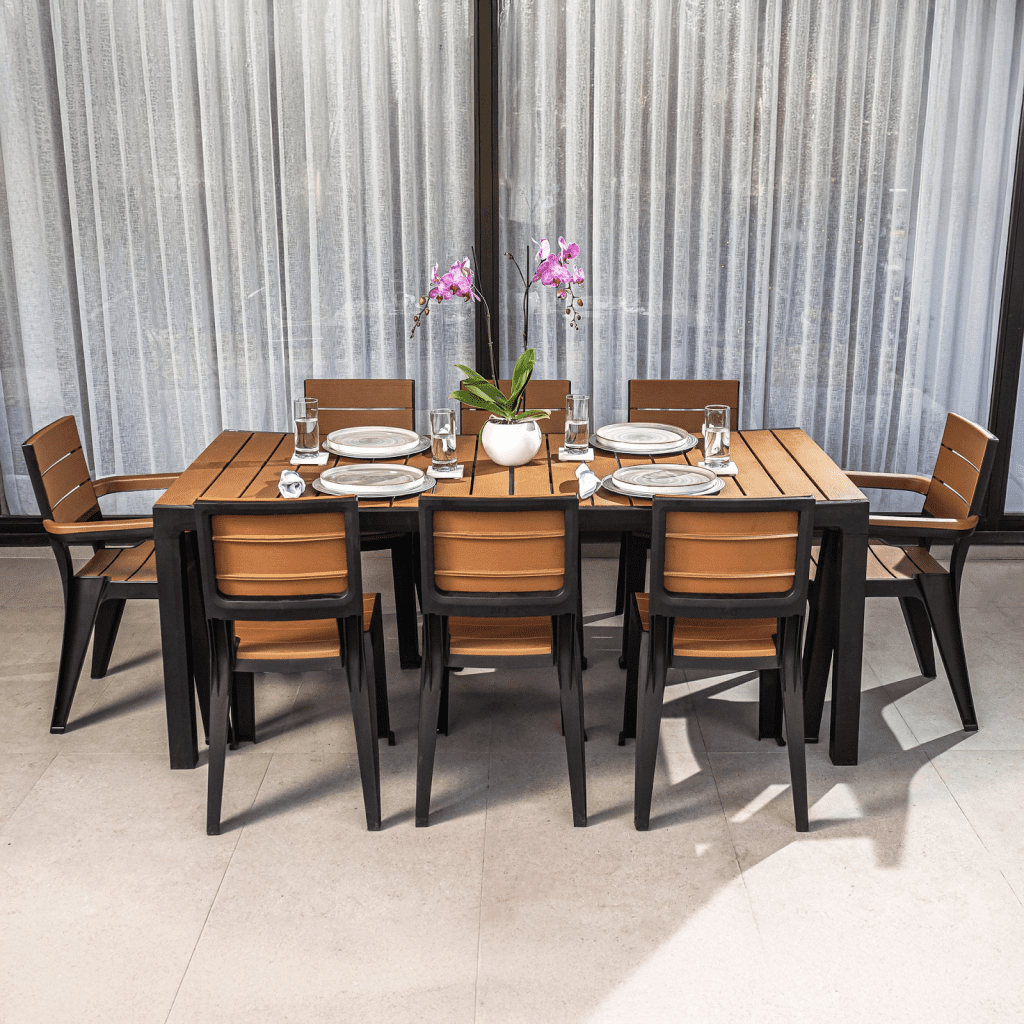 El tono tabaco en muebles de exterior ofrece un equilibrio perfecto entre elegancia y resistencia visual al desgaste. El comedor de ocho puestos tipo madera en color tabaco es una opción robusta y versátil para jardines grandes, terrazas amplias y espacios que requieren capacidad sin sacrificar la estética.