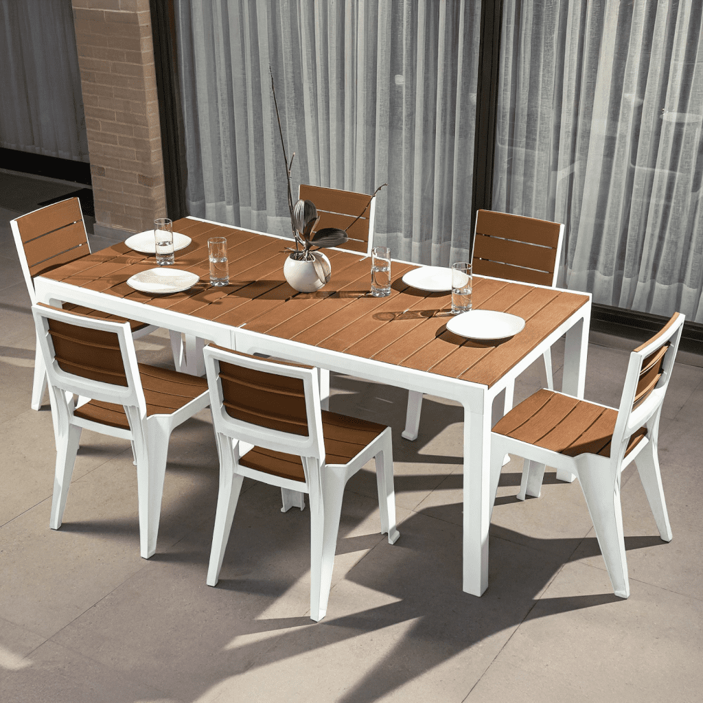 Cuando el espacio lo permite, los comedores de seis puestos ofrecen la combinación ideal entre capacidad y aprovechamiento del área disponible. El comedor para exteriores con mayor versatilidad en esta categoría combina líneas contemporáneas con materiales resistentes a la intemperie, convirtiéndose en una opción sólida para familias que buscan durabilidad sin renunciar a la estética.