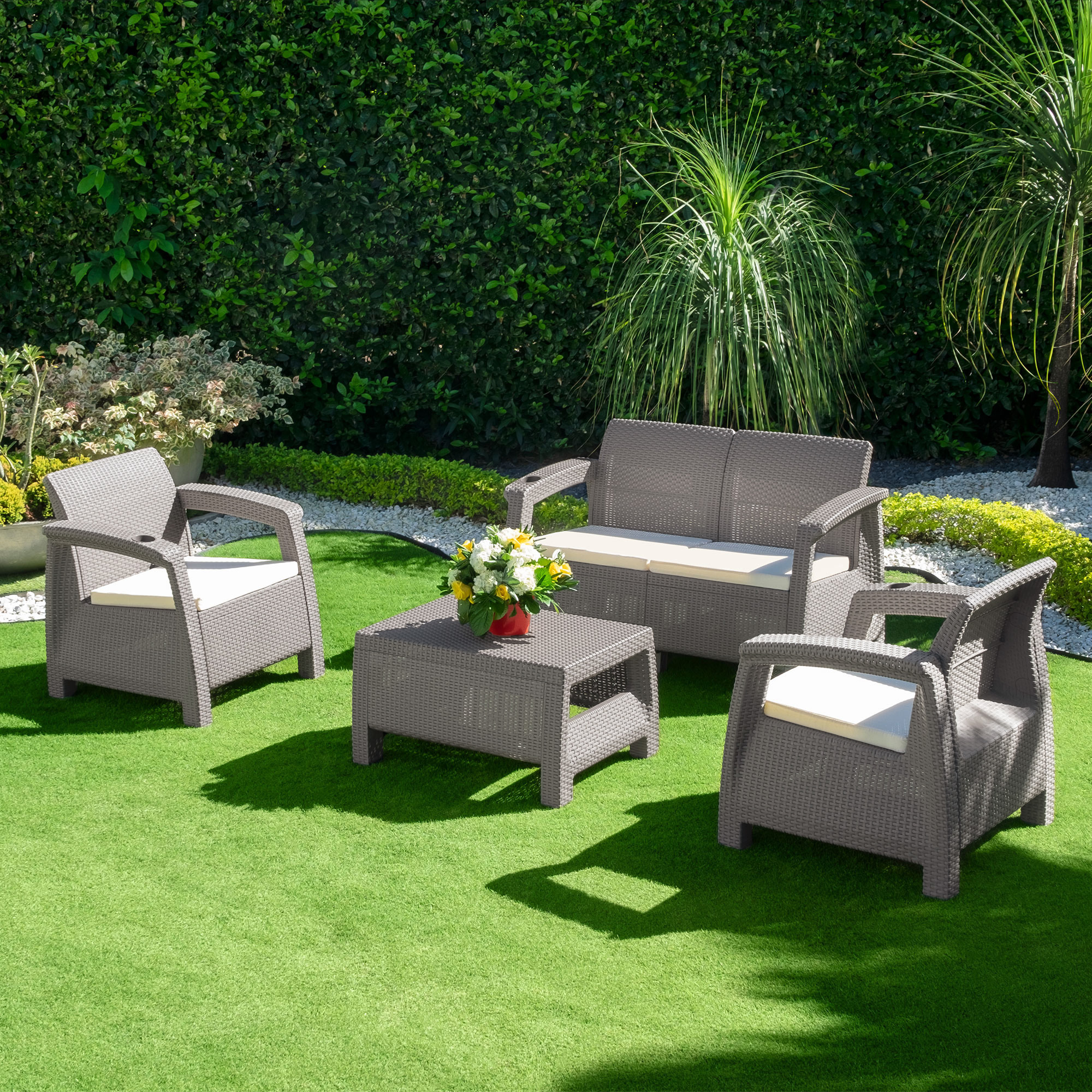 Incluye cuatro sillones Capri con cojín y una mesa Madeira Cuadrada.
