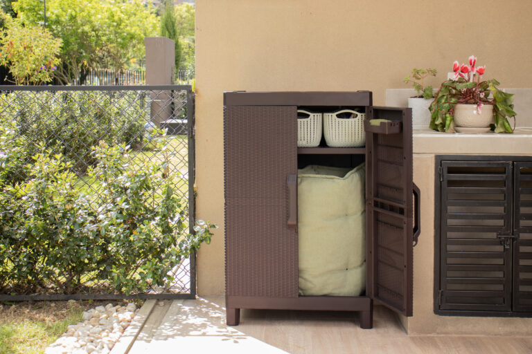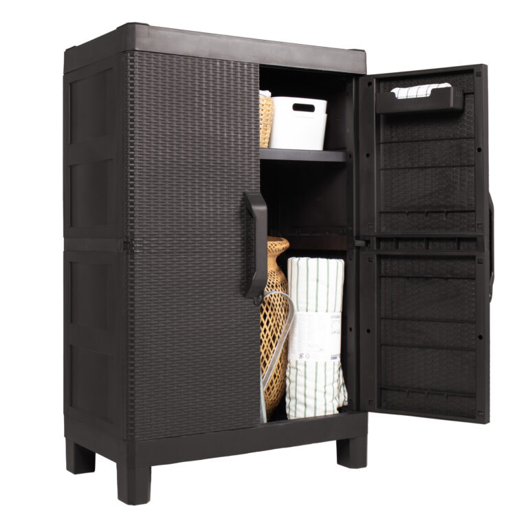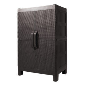 Armario Capri tamaño M en resina postconsumo reutilizada con textura tipo ratán, resistente y funcional. Dispone de repisa interna y puertas frontales para un almacenamiento práctico. Perfecto para organizar artículos en espacios interiores o exteriores.